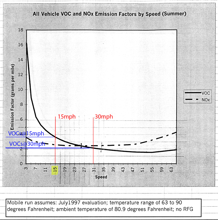 Notice that in both graphs, the pollution output at 15 MPH, the stated goal of project supporters, is almost double that of 30 MPH.