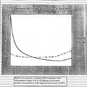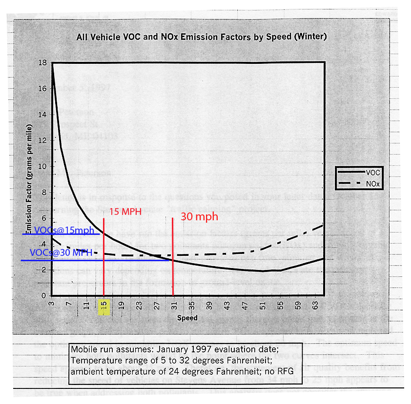 Department of Environmental Protection November 5, 1997 Brian Peterson Dear Mr. Peterson: This letter is in response to the questions you posed in your letter dated October 15 concerning the Stevens Avenue "traffic calming" project. At your request we have run the emission factors (grams per mile) versus speed of a vehicle (miles per hour) for two pollutants: nitrogen oxides (NOX) and volatile organic compounds (VOCs). In addition I have provided two runs: summer and winter as emissions can vary depending on temperature. NOX and VOCs are the primary pollutant precursors in the formation of ground-level ozone.