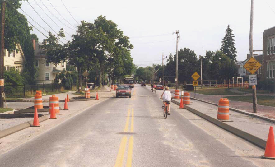 way. Stevens was widened in the 1960's because it was thought that making it wider would make it safer. There have been two known deaths on the street in the Deering Center area, both non-school age children who ran out from between parked vehicles. The first was about 1950, when a boy ran out between parked cars, was hit by a semi in front of Longfellow school, and dragged down to Deering HS. The other was around 1975, when a 6-year-old ran out of Pats Meat Market up the street, between two parked cars and got hit by a DPW truck that was backing up. Hump proponents have never explained how humps stop children from running into the road. They don't. How it worked: In July of 1997, asphalt curbing was applied to the street. Streets connecting to Stevens had bumpouts applied to the corners, rounding out into the street, and narrowing the street to about 1 1/2 cars width. Parking was eliminated in front of Longfellow where parents drop their children off for school, on both sides of the street. The bumpouts decreased the distance that pedestrians had to cross to reattain the curb. They had to take 3 fewer steps. The Alliance for Transportation Choice thought it was better for pedestrians to be closer to traffic also. (Click on images for larger view)