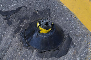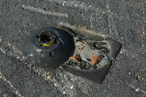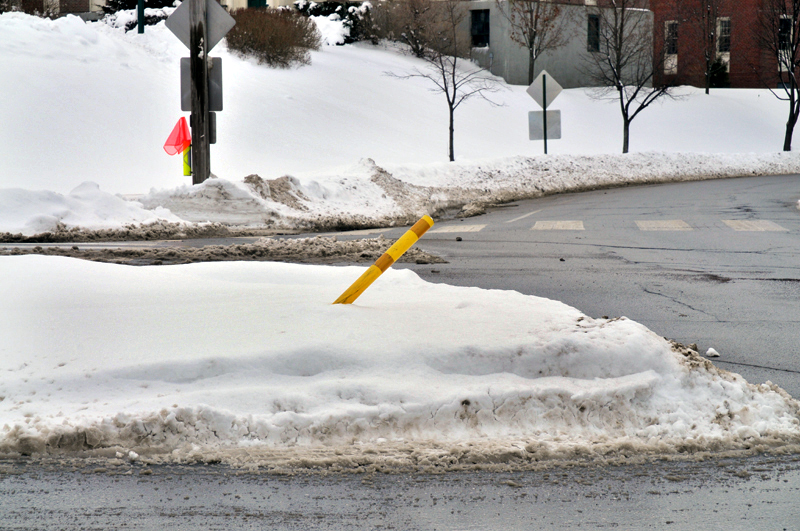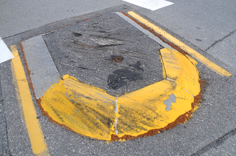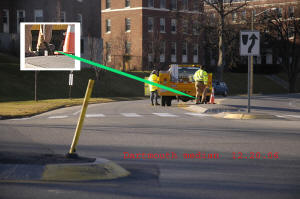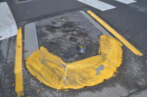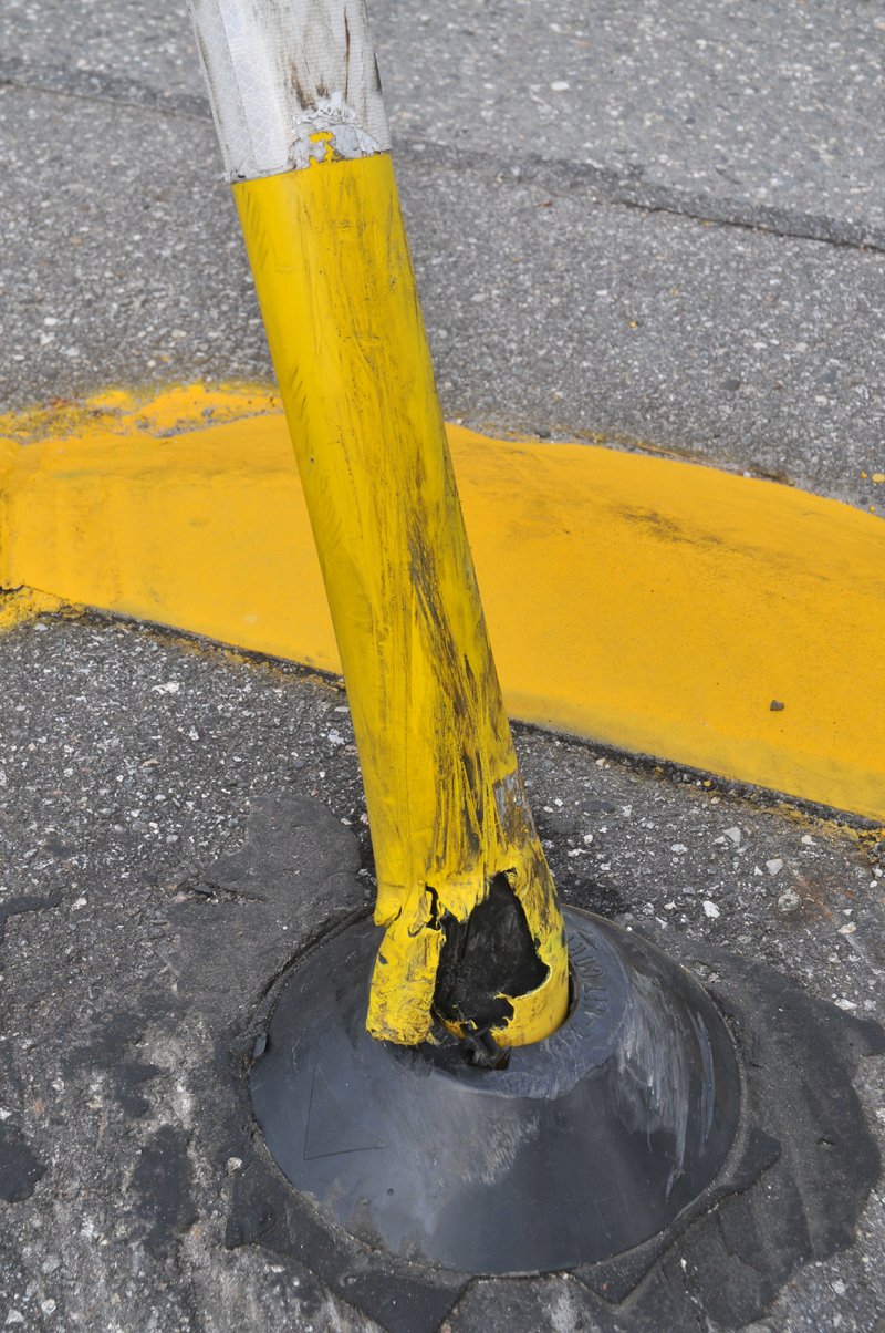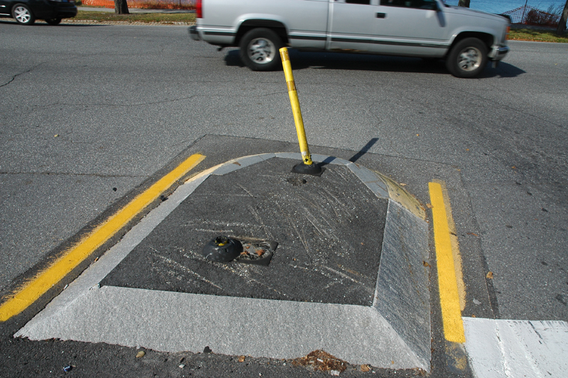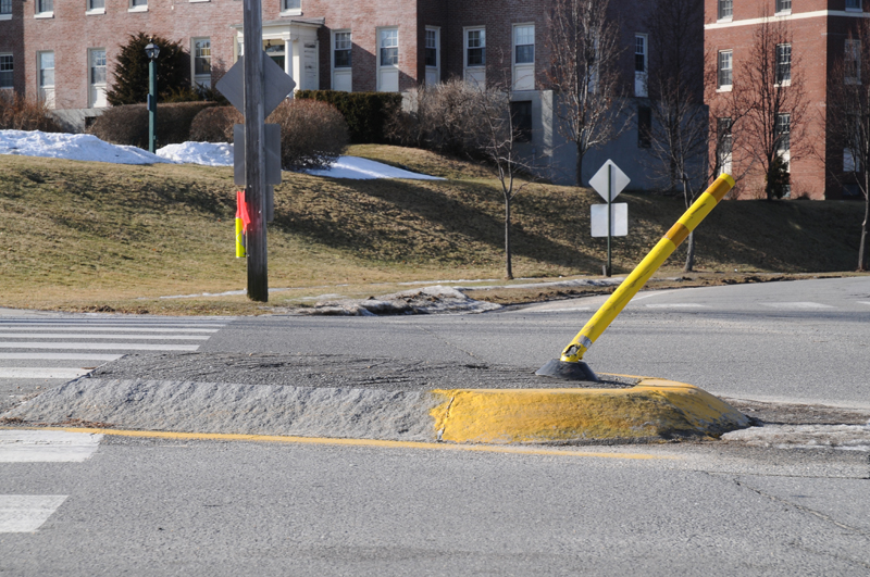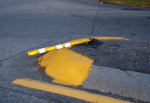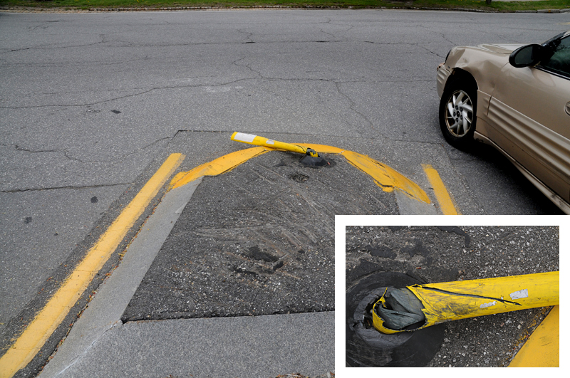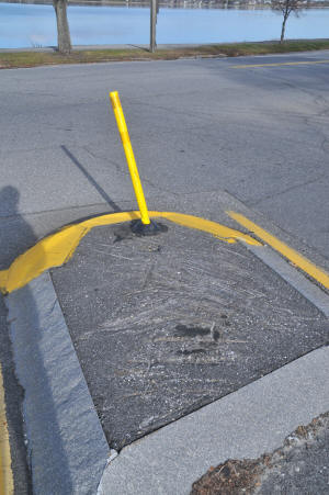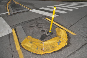 Medians : Dartmouth Street and Baxter Boulevard The Dartmouth median is interesting. As one goes around Back Bay with it on your left, heading intown, you make a sweeping turn to the left at the bottom of Dartmouth. The long median along the boulevard kind of forces you off to the right directly at the other median, and all the traffic at the bottom of the street stopped at the sign. This smaller one has the ubiquitous Safe-Hit stanchion mounted on the bay side of the median. It used to have two, but the City decided to economize I guess. They were and are getting ripped off and crushed regularly. It may as well be an arcade game, it gets replaced so often. This constant replacement is expensive. The thing to remember is that these stanchions and bases are TOUGH. Safehit makes a great product . I talked to a company rep in about 2004, and he told me it would take 5-8,000 pounds of force to crush one of these things. I guess we'll start off with my most recent picture, have 2010 in review, then go back a few years! It's not pretty, but it's interesting. Click on pictures for larger view This could go on and on, but like the Sham-wow guy says "I can't do this all day". Suffice it to say that the medians are an expensive, DPW-time-wasting scheme that doesn't much for the Portland roads except waste money. It sure doesn't improve anybody's safety. Gotta call DPW - see if my statements are still "unfounded". To Vannah Baxter Blvd. median Woodfords Median Back to top |