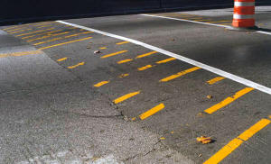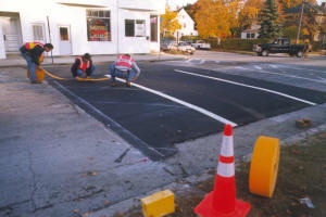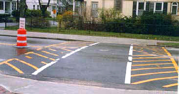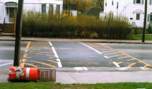 These humps were installed in November of 1997, marked with 3M Company marking tape made especially for the purpose. Taping of the then new hump in front of Deering High School. The crew is laying out the marking tape, and pressing it down with a hot roller. It supposedly would bond with the pavement, becoming a permanent part of it. This worked somewhat. Over the winter and into the spring, chunks of it were ripped off by plows, peoples undercarriages, and trailers. In the Fall of 1998 before school started, paint was applied over the tape to clean up the markings, as it was again in 1999, 2000, and 2001. Paint is lots cheaper, and seems to last as long. Traffic was moving between 3 and 15 miles an hour slower, again, with the greatest effect at the hump locations. Accidents had gone up 58% in the five months since the hump installation. Pedestrian and bicycle usage had dropped 8%.