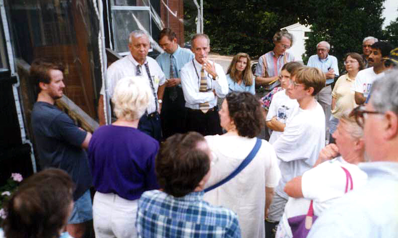 Right after the asphalt curbing got put in a home owner at the north end of Stevens arranged a meeting with DPW head William Bray and Tom Gorrill, one of the engineers at DeLuca-Hoffman Associates who designed the project. They were to meet in the parking lot of the Hayes Chiropractic Clinic at 808 Stevens Ave. on July 17th. Word of this got out, and Bill Bray arrived to find not just 2, but about 100 people VERY upset with what was going on. A couple of people liked the project but the great majority hated it. This is a small part of the crowd at the meeting at 808 Stevens Ave. on July 17, 1997. Facing the crowd in the white shirt is William Bray, Director of DPW. Next to him in blue is Thomas Gorrill, of Deluca-Hoffman, Inc; Police Chief Michael Chitwood (hand to mouth); Mary Butler, DPW Public Affairs person; and Peter Hedrick (striped shirt), of DeLuca-Hoffman, Inc.