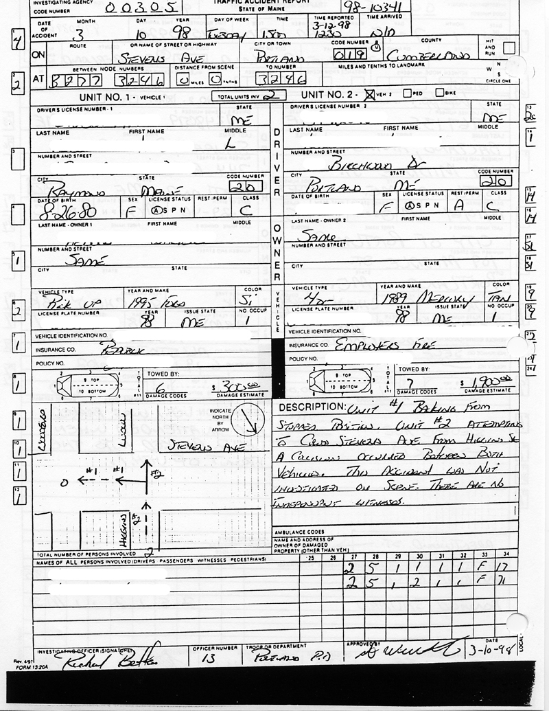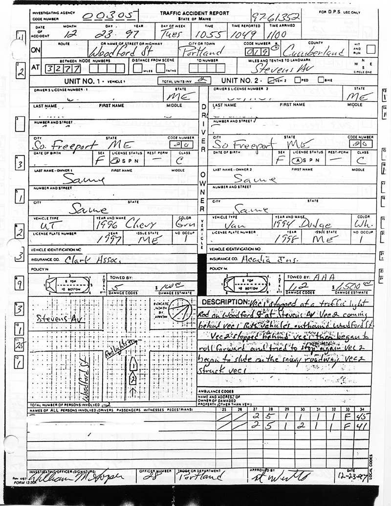 97-61352: Dec. 23, 1997: 1055am, snowy road. Vehicle # 2 rear-ended Vehicle one after a stop, then rolling forward, unable to stop on the slick surface. 97-6136 : Dec. 23, 1997 : 1138am, Vehicle 1 stopped for a red light, Vehicle #2 was unable to stop while slowing on the slick surface. 98-914 : Jan. 7, 1998: 915am , Vehicle # 1 was parked in front of Quality Shop unattended when Vehicle #2 backed into it. 98-10341: Feb. 10, 1998 reported at 1030am: Vehicle # 1 was stopped at the Woodfords / Stevens Ave light, and backed up a block, colliding with a car crossing Stevens from Higgins St. to Ludlow. No # : March 23, 1998, 626pm: Car #2 stopped close to the Woodfords / Stevens intersection, in front of a driveway, and noticed that somebody was backing out. #2 backed into #1, causing "minor damage" NOTE: There is no speeding mentioned anywhere in these "representative" examples. That's probably because there WAS no speeding problem on Stevens. It was manufactured to get money from the federal and state government, and that's illegal. Because of the confluence of the signal light at Stevens and Pleasant, and the crossing guard in front of the school, when school children are in front of the schools traffic may be able to get up to 15 MPH if it’s lucky. 5-10 MPH, just where it should be, is more likely. The crossing guard didn't have 4 complaints lodged against him in 1997 by the drivers of the busses he was slowing down, for nothing. They were running late. DPW head William Bray stated to the Portland Press Herald that accidents had decreased after the speed tables were installed. He stopped saying that after I told him that according to Maine DOT there were 35 accidents prior to the hump installation and 59 afterwards, which didn't seem like a "decrease" somehow. It's a 58% increase according to the FHWA. I spent a few hours at the Portland Police Department in early February 2001 looking at all the accidents that had occurred on Stevens from 1996 to that date. Accidents had increased 40% since the humps were put in--and that is with 2,500 fewer cars on the road. I found 5 that occurred as a direct result of people slowing for speed humps - they were rear-ended by people not paying attention to their driving. The car in front would slow for the humps, and the following car would ram the first one.. Driver inattention, failure to yield, and obstructed vision were still the leading causes of accidents on the street. Speeding (improper speed) was the cause of 2 accidents- interestingly, the same number that hump proponents thought was so bad back in 1997 - and that was with 2,500 more cars on the street (16,000 vs 14,500 today)! So, things have gotten worse! So, what is causing the 58% increase in accidents? It could be that the slower speeds create a situation where the driver is now paying less attention to the road just because he is going more slowly - less speed, less "risk", more inattention - which leads to people rear-ending the cars in front of them. Thus, project proponents have created the exact opposite of the results they were looking for.