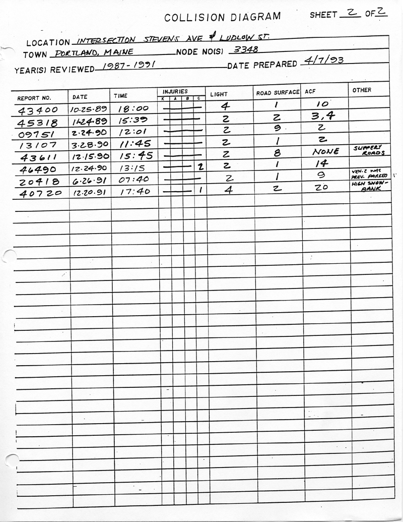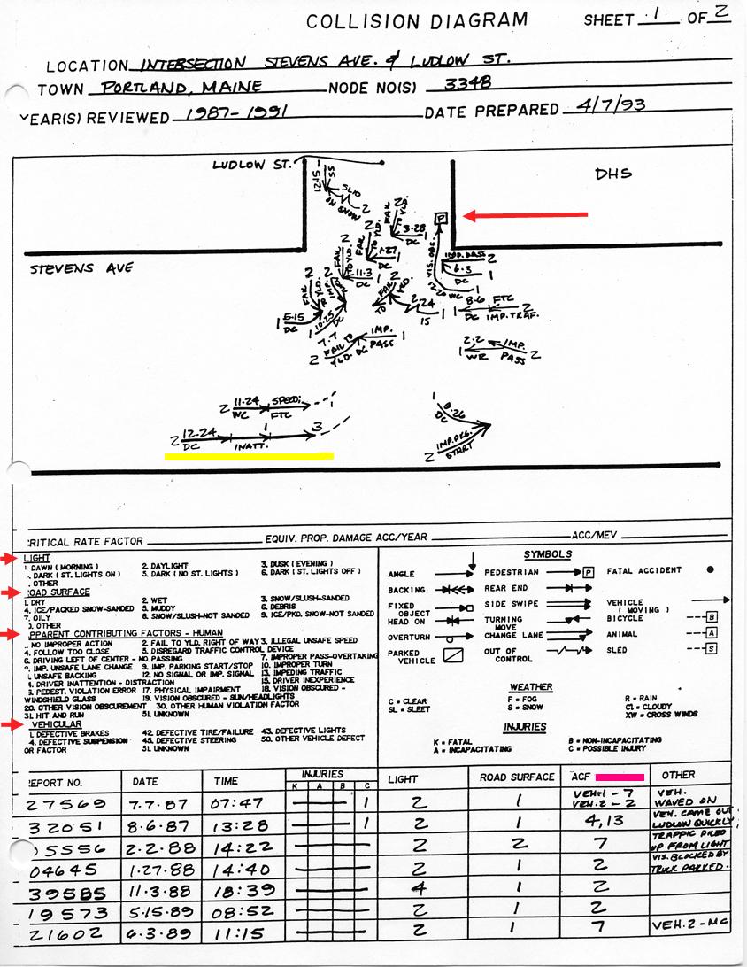 Stevens Avenue Project : Speeding and Accidents 1998 VEHICLE ACCIDENTS 1993 Stevens Avenue Pedestrian Study Phase I --Data Collection andProblem Identification Report is here. 1998 PACTS Phase I Report Final Monitoring Report is here. Phase I Final Technical Supplement Appendix III Accident data is here. click for larger image